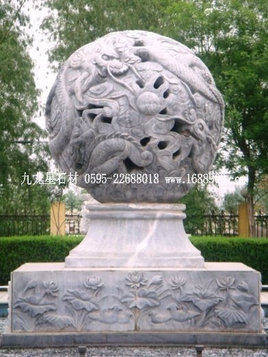 圓融承祥(圖騰球):用料為大石窩之青石,鏤刻中空,直徑2米,壁厚20厘米,沿基座通高3.3米,共重15噸。由6名工匠歷時(shí)2個(gè)月雕刻而成。