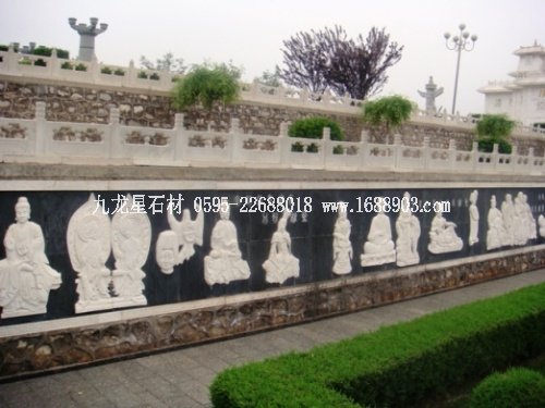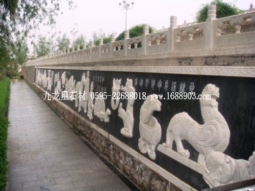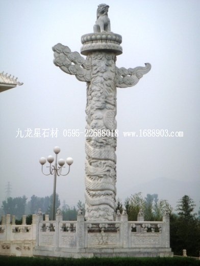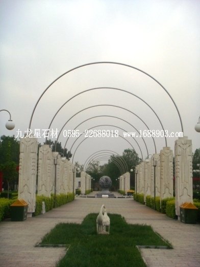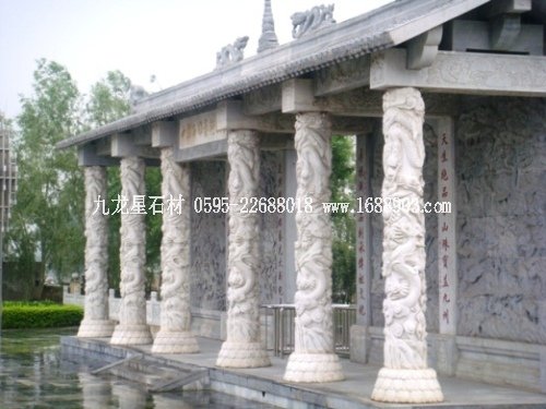 漢白玉浮雕柱:全部為漢白玉雕刻而成,共24座。與一年24個(gè)節(jié)氣相合,同時(shí)又與大石窩鎮(zhèn)行政村數(shù)相合。每座雕柱高4米,重約6噸。
