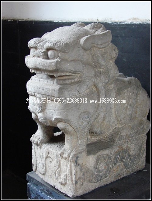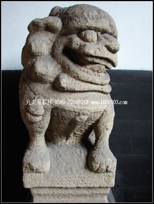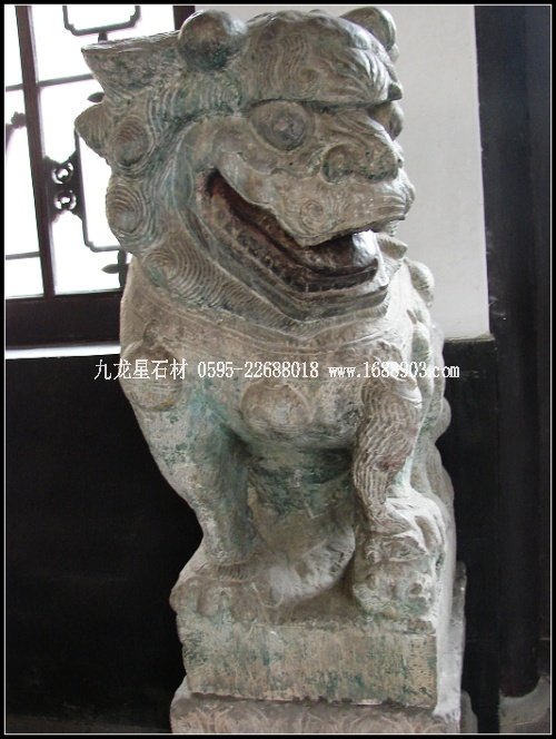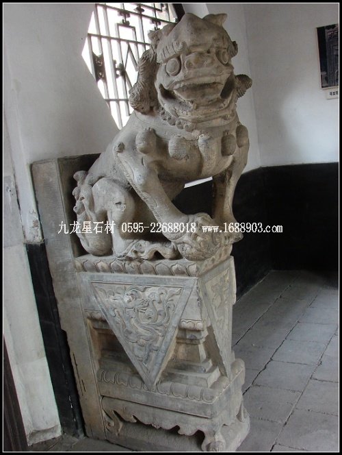 子是莊園青石雕刻的又一大類別。眾多的門墩石獅,經(jīng)清代民間藝術(shù)家的大膽想象、沿承、夸張,這一藝術(shù)品成了宅第建筑中不可替代的裝飾像,無(wú)論體量大小,均威武、高貴而又憨態(tài)可掬。為增強(qiáng)裝飾效果,莊園的獅子形象大多頭大臉闊,額隆頰豐,箕口肉鼻,前額突出,從禿頂式的頭部到項(xiàng)背披有漩式鬣毛。胸飾纓絡(luò)華飾,脖上掛有鈴鐺,形態(tài)俯首縮足。雌獅掌撫幼獅,有的還背負(fù)其子;雄獅腳踏繡球或嘴銜彩帶,背負(fù)繡球,較多地汲取了民間傳統(tǒng)舞獅藝術(shù)的成分,富有較強(qiáng)的鄉(xiāng)土氣息和喜慶風(fēng)格。