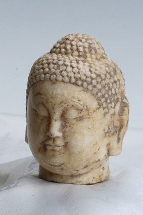 佛造像是佛教的載體,通過對佛造像年代、工藝、造型及風格的研究,有助于認識和了解古代雕刻藝術(shù)、文化史,古人的審美情趣以及古代的政治、經(jīng)濟和科技發(fā)展水平??v觀佛造像制作材料,有木制、泥塑制、金屬制、牙骨制、陶瓷制和石制。其中以石刻雕制的難度最大,因為它涉及石料的選擇、開采、運輸,體大量重,雕刻打磨實屬不易。唐代石刻佛造像是把人與精神、現(xiàn)實與理想完美地結(jié)合在一起的最佳表現(xiàn)形式。那么就請大家一同欣賞這尊唐代漢白玉佛首的神韻和藝術(shù)感染力以及由此帶給我們大家的宗教、歷史、文化等方面的信息吧。