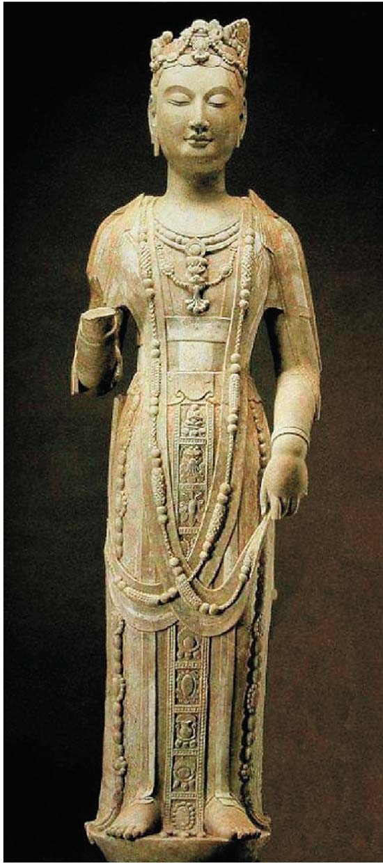 魏晉以來(lái)的佛教石窟造像,基本上都是貼壁圓雕或高浮雕,單體造像碑也大多有背屏。真正能夠360°欣賞的圓雕,現(xiàn)在能夠看到的最早與最 好的作品就是青州出土的石雕佛像和菩薩像,這是真正的中國(guó)精神、中國(guó)氣派,雖然在形式上借鑒了印度笈多美術(shù)的樣式,但造型特征與精神內(nèi)涵完全是中國(guó)的。