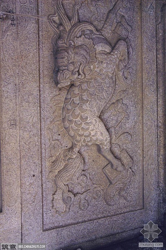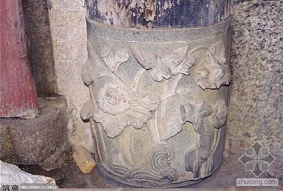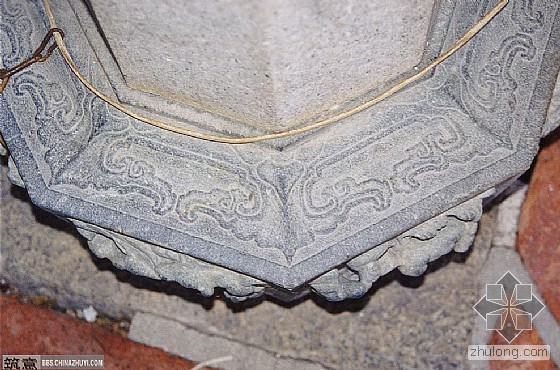 | 圖中左右兩個壁柱下石作下段也一樣,稍小。和須彌座的圭角一致的是都立于土襯石上。按照劉大可《中國古建筑瓦石營法》標準的須彌座的圭角用如意云。倒是圖中形狀有象龜腳之處;整體應該是仿幾案。臺灣研究閩南古建的學者稱之為“柜臺腳”。
