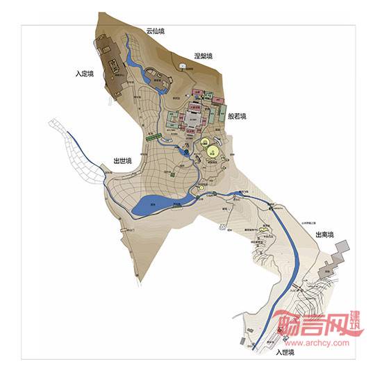 入世境為寺域前區(qū),作停車、暫時(shí)休整之用;山門為情境轉(zhuǎn)換媒介,拾階而上,山林夾道,洗滌心靈,是為出離境;寺院前部為平坦區(qū)域,以水田農(nóng)禪景觀為主,視野開闊,設(shè)置放生池,種蓮養(yǎng)魚,利用參天古樹和竹林營造自然茶室,茶亭茶室與植物互為取景,交相輝映,分布錯(cuò)落有致,形成趣味的園林廊道系統(tǒng),一派世外桃源景象,是為出世境;寺廟殿宇區(qū)域?yàn)榘莘饍x式及僧人居住生活場(chǎng)所,以唐風(fēng)建筑及庭院為主,是為般若境;經(jīng)過禪堂,石階引向后山的祖師塔區(qū)域,在祖師塔上加茅草穹頂,暗示祖師結(jié)茅而居,是為涅槃境;寺廟后方沿山而建的禪修中心和善客堂,為禪修者提供的專修場(chǎng)所,用高大喬木和竹林與寺廟區(qū)分隔,獲得寂靜氛圍,是為入定境;后山密林深處,罕有人至,閉關(guān)獨(dú)居,悠然逍遙,是為云仙境。