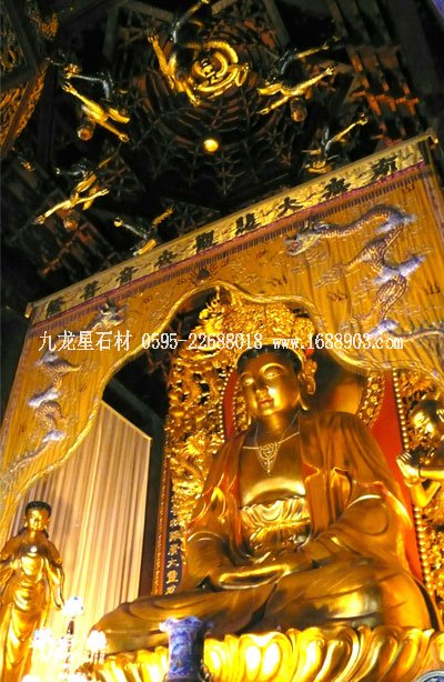 九龍殿:可以說是普陀山上龍文化的集大成之杰作。此殿在清康熙三十八年建成后,世稱“宏制巧構(gòu),甲于東南”,名聞天下。據(jù)史料記載,清康熙四年,普陀山曾遭荷蘭殖民主義者侵占和掠奪,法雨寺殿宇被毀。三十八年經(jīng)康熙恩準(zhǔn),將金陵故宮的琉璃瓦和舊殿九龍?jiān)寰疬w于此,故而此殿的來歷不同凡響。為目前國內(nèi)寺院建筑中規(guī)模最高的一座佛殿,亦是法雨寺的主殿。九龍殿的特點(diǎn),重檐黃瓦,宏偉深廣,殿頂內(nèi)槽九龍?jiān)寰?穹窿成拱形,一龍盤頂,八龍環(huán)繞八根垂柱懸空而下,昂首舞爪,搶抓居中懸掛的琉璃燈,形成九龍搶珠之勢。其造型之生動,工藝之精巧,堪稱普陀一絕。在九龍殿中還有48根柱磉,均為透雕蟠龍,隆鼻斜眼,張發(fā)伸爪,各呈異態(tài),更使九龍殿增添了龍文化的風(fēng)韻和色彩。 也許是九龍殿的名氣太大了,歷代名人或文人所寫的楹聯(lián)、匾額、詩詞頗多,亦可能是歷代名人的眾多作品,因此進(jìn)一步提高了九龍殿的知名度,或許兩者兼而有之。如新編的《普陀山志》的楹聯(lián)篇中寫九龍殿的就有七條,占法雨寺佛殿之首。其中有菲律賓華僑葉健民、施佩君合家敬獻(xiàn)的“天華降錦屏,九龍殿中騰光輝;法雨潤靈鷲,白華山上顯感應(yīng)”,此為代表作之一。清朝金土奎的詩《法雨寺》中亦有“九龍殿已偕山老,五門對海雄”等吟九龍殿的詩句等等,可見九龍殿影響之大。