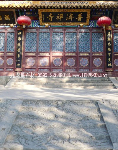 普濟(jì)寺正山門前有塊龍階浮雕斜放在步階上。這是一塊約4平方米多大小的青石板,上面雕著“群龍戲珠”圖案。四條蛟龍圍繞中間那顆明珠游動,吞云吐霧,富有動態(tài)感,常吸引眾多游客在此前拍照留影。