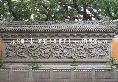 九龍壁:在法雨寺天王殿對面照墻處,1988年由溫嶺縣長嶼鎮(zhèn)民間石雕工匠梁宗濤等人用質(zhì)地優(yōu)良的青石板精雕細(xì)刻而成。它是仿照北京故宮九龍壁,卻又不同于故宮、大同等地的陶制九龍壁。法雨寺九龍壁是用60塊70厘米見方的優(yōu)質(zhì)青石,精雕細(xì)鑿,拼接而成。有的石板上是半個龍頭,有的石板上是一只龍角,有的石板上是一只龍爪,拼接起來竟然不露縫隙,像是在一塊青石上雕刻而成。這不僅有濃厚的刀味,石趣,更顯示了民間雕匠的高超工藝。此座九龍壁高2米,長12米,浮雕凸出16厘米。九條青龍騰飛于云山碧海之間,盤旋翻滾,爭奪龍珠,造型逼真,栩栩如生,富有立體感。而在梁與梁之間還雕有十七條造型各異的小龍,昂首舞爪,十分生動,更使這九龍壁群龍盤舞,似有龍將破壁,呼之欲出之感。此壁于1987年由香港同胞捐建。壁的東側(cè)還立有《新建九龍壁功德碑》,碑文曰:“法雨寺原有照壁,前有石牌檔,以條石和塊石為之?!虻鬲M樹大不相稱,始新建九龍壁,取龍?zhí)鞊碜o(hù)之說,且又與九龍殿相對稱,”云云。