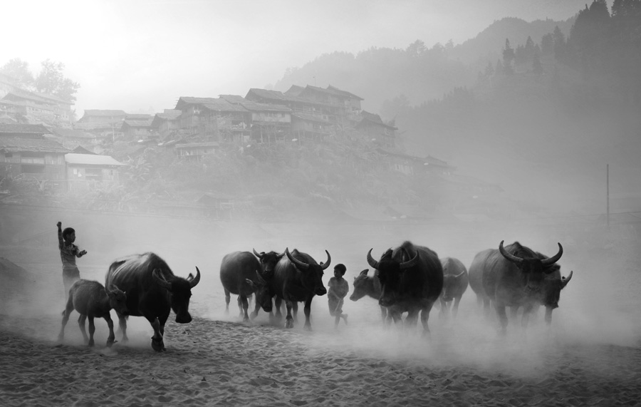劉奕---放牧古村。作品攝于貴州黔東南卡寨,座落在一座地勢(shì)險(xiǎn)要的半山腰上,遠(yuǎn)遠(yuǎn)望去,寨上一座座高聳入云的樓房鎖在煙霧中時(shí)隱時(shí)現(xiàn),充滿了神秘的色彩,兒童放牧的歡騰場(chǎng)景,為神秘的古寨增添了生活的氣息。