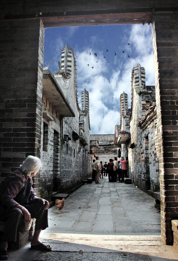 黃靈輝---古村來(lái)客。作品拍攝于2012年3月的一個(gè)下午,作者被高低起伏層層疊疊的鍋耳樓群的氣勢(shì)深深吸引和打動(dòng),這時(shí)剛好有一個(gè)白發(fā)蒼蒼的老阿婆坐在古村門樓內(nèi)的石板凳上,或許是感到稀奇,不停的回首張望著古村里的游客們。