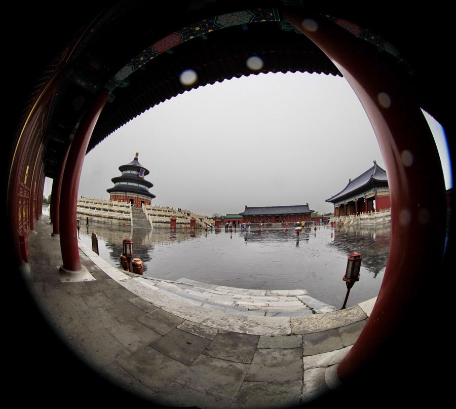 冀曉俐---天壇。天壇是著名的皇家園林,作者為表現(xiàn)它的宏偉氣勢(shì)呢,利用雨天地面的倒影增加它的韻律,再用屋檐下的柱子做框架,經(jīng)過(guò)魚眼鏡頭寬范的超角度的拍攝,把祈年殿收入其中。