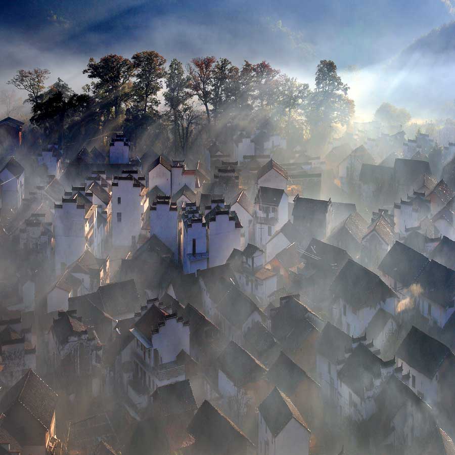 蔡龍---徽居。作品拍攝于皖南的一個(gè)山村,站在山坡上放眼望去,那一株株梨樹漫山遍野,白茫茫的一片,像起伏的波浪。在徽派建筑群的印襯下,展現(xiàn)眼前是一幅美麗的畫卷。