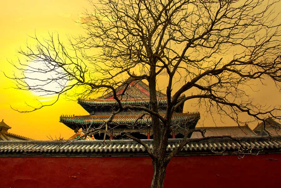 葉峰---故宮夕陽(yáng)。作品展現(xiàn)了在殘陽(yáng)的余輝,金光映照著孤獨(dú)宮殿下, 在枯萎的大樹影襯下讓人感慨一個(gè)帝國(guó)的消亡,中華文明博大精深。