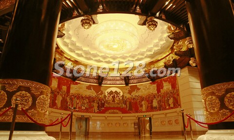 【洛陽(yáng)武則天·天之圣堂】這座在武則天禮佛堂遺址上復(fù)建的文化建筑,使用了石材作為主材之一,其中最為出色的是地面巨型石材拼花,但樓梯、柱座、墻角等諸多細(xì)節(jié)上的雕刻產(chǎn)品也頗為精彩。