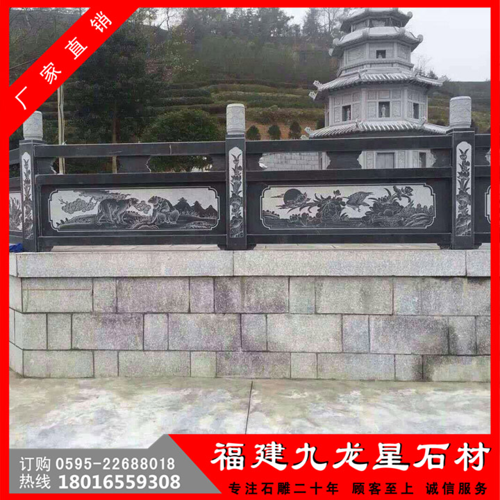 青石石雕欄桿表面色澤均勻,外觀光彩奪目,猶如那湖中的蓮花般出淤泥而不染,在維護人們安全時給予人們一種溫馨而美好的意境。青石欄板上的圖案更是各有千秋耀眼奪目,有刻畫著山水情懷,有亭臺樓閣,有圖文并茂,有人魚鳥獸等。在各個地方展現(xiàn)著不一樣的風(fēng)采。