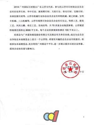 2015年3月20日,云浮市石材商會也發(fā)出了云石商字(2015)第02號文,希望云浮的石材企業(yè)也積極報名參展,云浮石材企業(yè)在云浮石材商會、云浮機械協(xié)會、云浮觀賞石協(xié)會的帶領(lǐng)下,2014年的參展面積達(dá)到了8000平方米,2015年的參展面積預(yù)計將會突破10000平方米,云浮市石材商會與廣州石材展簽署三年的戰(zhàn)略合作協(xié)議,每年的參展規(guī)模將會上漲20%以上。