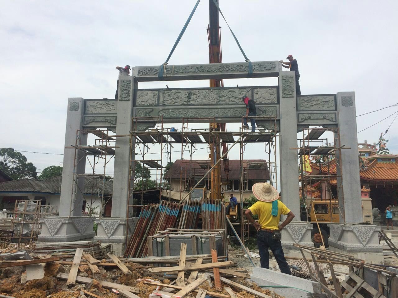 本公司的馬來(lái)西亞客戶石雕牌坊安裝中
