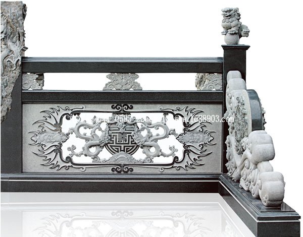 青石透雕石欄桿低欄高0.2~0.3米,中欄0.8~0.9米,高欄1.1~1.3米。欄桿柱的間矩一般為0.5~2米。透雕題材為:雙龍戲珠。
